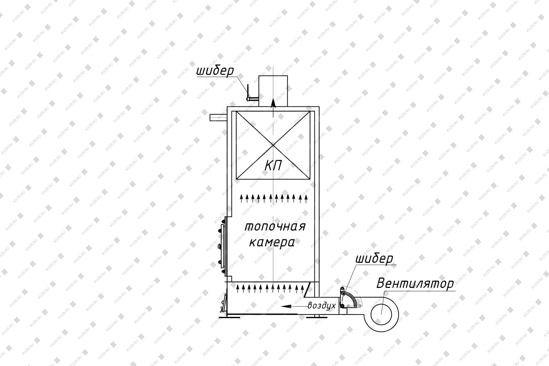 Подвод воздуха в водогрейный котел КВр-0,3 КБ, на горение осуществляется в топку под слоевую решетку принудительно при помощи дутьевого вентилятора, регулирование расхода воздуха проводится шибером.