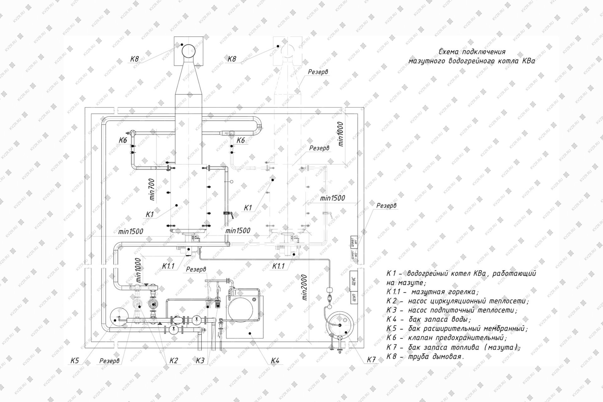 Чтобы правильно подключить котел 1.0 МВт на мазуте в котельной необходимо оставить проемы для обслуживания оборудования во время эксплуатации. На представленной здесь схеме указаны их минимальные размеры. Кроме того, в данной примерной схеме монтажа водогрейных котлов и оборудования указан перечень минимально необходимого вспомогательного оборудования для правильной работы котла.