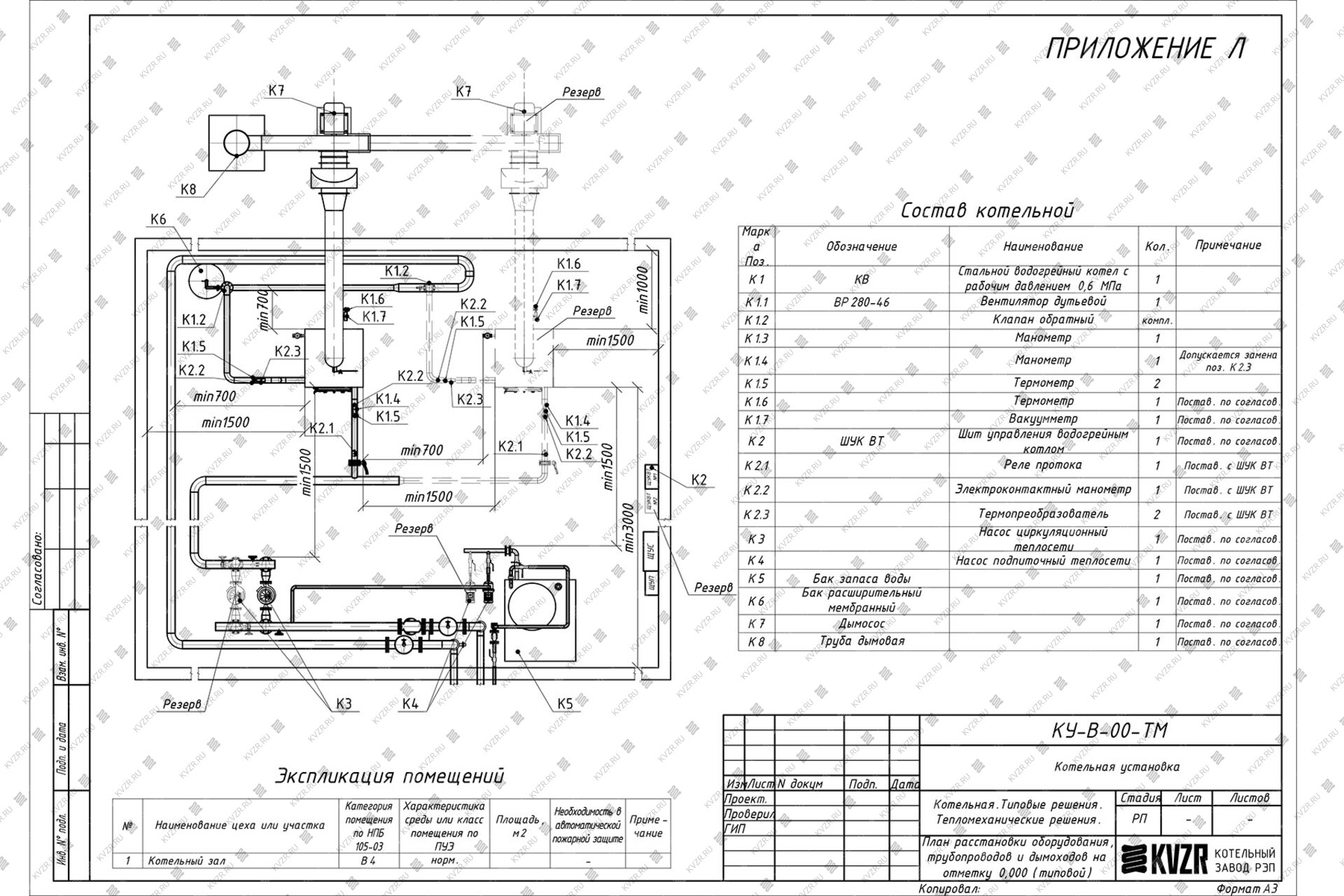 Чтобы правильно подключить котел 0.2 МВт уголь дрова в котельной необходимо оставить проемы для обслуживания оборудования во время эксплуатации. На представленной здесь схеме указаны их минимальные размеры. Кроме того, в данной примерной схеме монтажа водогрейных котлов и оборудования указан перечень минимально необходимого вспомогательного оборудования для правильной работы котла.