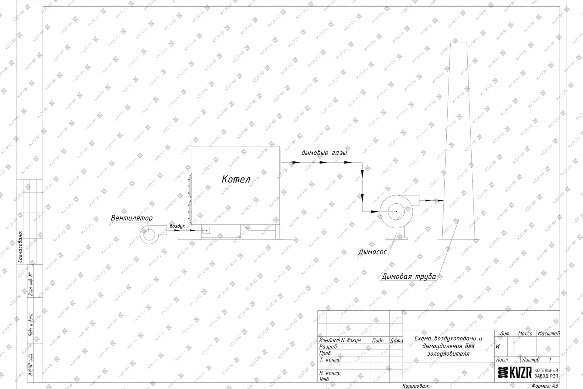 2. Горение: Воздух на горение твердого топлива подается принудительно дутьевым вентилятором. Интенсивность горения регулируется шибером на воздуховоде.
