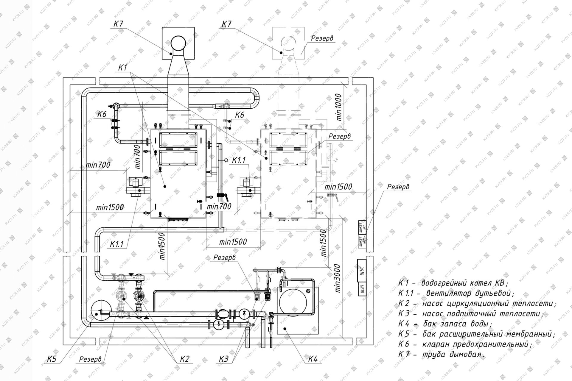 Чтобы правильно подключить котел КВ-1.25 без дымососа на самотяге в котельной необходимо оставить проемы для обслуживания оборудования во время эксплуатации. На представленной здесь схеме указаны их минимальные размеры. Кроме того, в данной примерной схеме монтажа водогрейных котлов и оборудования указан перечень минимально необходимого вспомогательного оборудования для правильной работы котла.